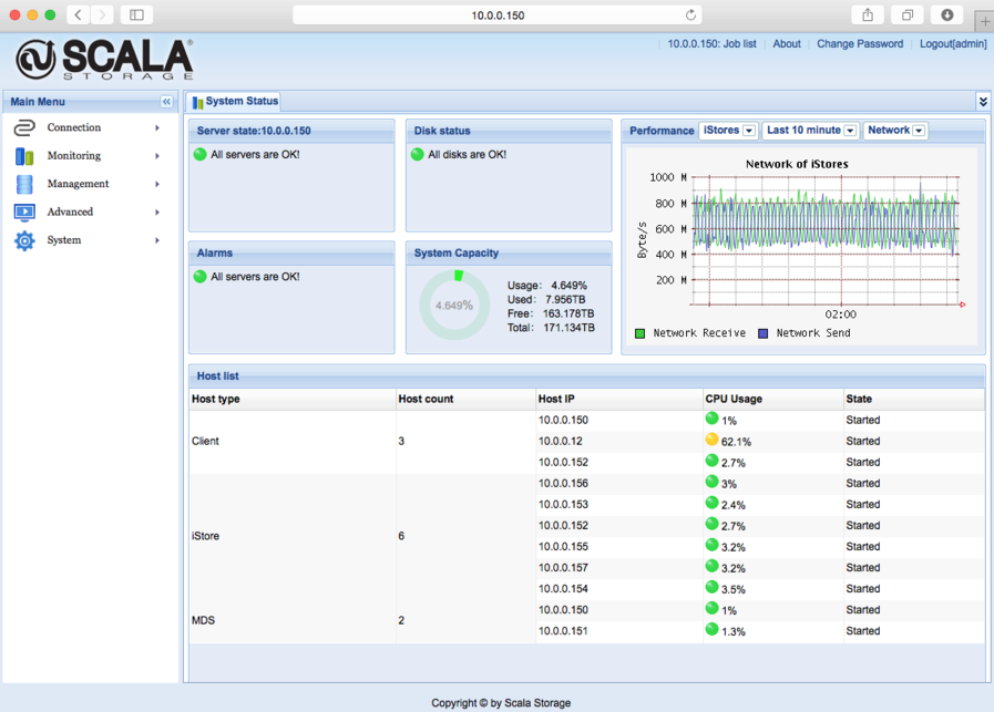 System capacity, performance and Metadata, iStore and clients system status can be viewed under a single web-based management interface. Managing TBs of data is as easy as handling PBs of data.